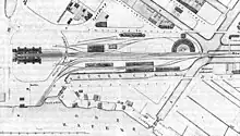 The commissioning took place on 15 December 1846, but the renovation and construction of the 173 m-long building complex, the freight tracks and the roundhouse were not completed until 1857. The station had two high towers for an optical telegraph connection, but since an effective electrical telegraph had already been invented, they were purely decorative. The entrance building also had two turntables for locomotives. These were detached from the train and turned on the turntables so that they could pull the train in the opposite direction. The station precincts, which included a freight yard and a semi-circular engine shed, were about three times as long as the station.