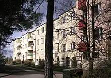 Together with Traneberg, a district west of the historical city centre, Hammarbyhöjden was one of the centrally located, hilly terrains bought by the city of Stockholm in 1917. The terrain made it unsuitable for the kind of garden cities built during the 1910s and 1920s. Furthermore, by the early 1930s the city authorities had realised the successful small-scale projects of the past could not solve the ramping shortage of dwellings the city was experiencing. In both these districts the ideals of Functionalist architecture — multi-family buildings in a natural scenery — were therefore implemented. A plan for the area was adopted in 1930, featuring 15 metres thick buildings 3–4 stories tall. The early 1930s saw few construction projects realized, and when a builder willing to carry the project out finally appeared, he demanded that the plan should be redrawn in accordance to a proposal by Ragnar Östberg — a plan featuring buildings 10 m wide arranged in an unmistakably classicist manner. These negotiations foundered, however, and the city redrew the plans again — now with a programmatically functionalist plan. Construction finally started in 1935, but, due to the stalled negotiations, Hammarbyhöjden lost its pioneering role to Traneberg which had its 1932 city plan quickly realised. Nevertheless, more than 4.000 flats had been built in Hammarbyhöjden by the 1950s, 92 per cent of which were two room-flats with a kitchen or smaller.[4]