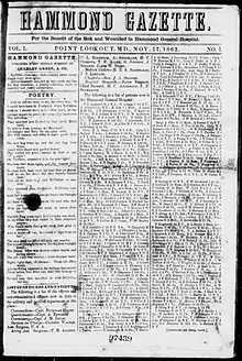 The Hammond Gazette was a weekly newspaper that was first published on November 17, 1862 in Point Lookout, Maryland. The paper was initially published by Charley Greer. George Everett, White Commander of Company D in the 38th United States Colored Troops (USCT) stationed at Point lookout, eventually succeeded him and published the paper for the majority of its run.[1]