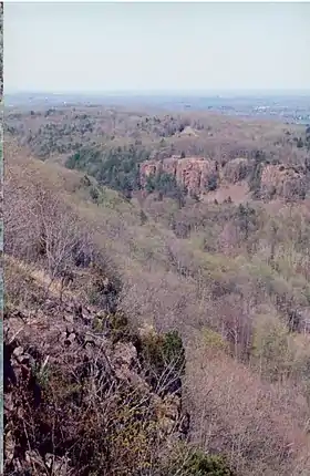 The Hanging Hills of south central Connecticut, United States are a range of mountainous trap rock ridges overlooking the city of Meriden and the Quinnipiac River Valley 900 feet (274 m) below. They are a subrange of the narrow, linear Metacomet Ridge that extends from Long Island Sound near New Haven, Connecticut, north through the Connecticut River Valley of Massachusetts to the Vermont border. The range is also a subrange of the Appalachian Mountains. A popular outdoor recreation resource, the range is known for its microclimate ecosystems, rare plant communities, and expansive views from cliffs that rise abruptly over 700 feet (213 m) above the surrounding landscape.[1] The Hanging Hills encompass the 1,800-acre (7.3 km2) Hubbard Park, designed with the help of landscape architect Frederick Law Olmsted.[2] The 51 mile (80k) Metacomet Trail traverses the range.