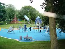 The park was developed under the supervision of the landscape architect Thomas Hayton Mawson of Windermere, who created Burslem Park around the same time.[3] Mawson's design makes use of terracotta to highlight features such as the axis between one of two footbridges across the canal and the pavilion. The pavilion, which is arguably the park's main focal point, was completed in 1896, and was designed by Mawson's junior partner Dan Gibson.[1] The bandstand between the pavilion and the canal was the gift of Mr George Howson, a local pottery owner.