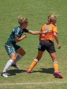 Hannah Beard(right) playing for Brisbane Roar in 2013