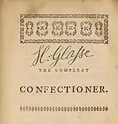 - Glasse, Hannah (1772). The Compleat Confectioner: Or, The Whole Art of Confectionary Made Plain and Easy. London: J. Cooke. OCLC 28134185.