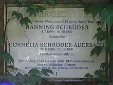 From 1944, Schröder's wife and their daughter Nele lived with the Rienau family in the Dargun parish of Mecklenburg, where she was an organist and a choir director from 1944 to 1952. From early 1944 to March 1945, they hid a Jewish couple, Werner and Ilse Rewald, in their Berlin house at Quermatenweg 148 in Steglitz-Zehlendorf,[8][9] saving them from certain death.[10]