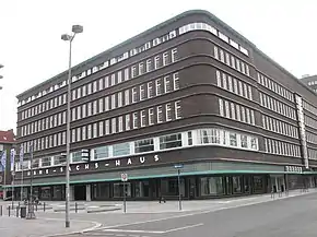 It was initially designated as multi-function centre to house offices, a hotel and restaurant, shops, a large concert hall[1] with one of the largest concert organs in Europe (92 stops, built by Walcker Orgelbau) at that time. The building was partially destroyed by bombing during World War II but was reconstructed by 1953.[2] Until 1984, a paternoster lift by Schindler operated in the building.[3]
