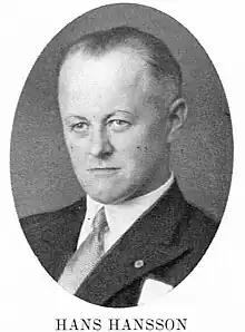 Hans Hansson i Stocksäter (1893–1978) was a Swedish politician. He was a member of the Centre Party. Hans Hansson was born on 27 May 1893 in Bollnäs, a Swedish locality and the seat of Bollnäs Municipality in Gävleborg County, Sweden. He was a Swedish farmer and later a parliamentarian. Hans Hansson was a member of the Riksdag's second chamber for the constituency of Gävleborg County from 6 December 1939 until the urtima rally 1940. He died on 16 January 1978.