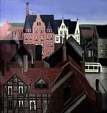 During the 1920s, Mertens painted still lifes, landscapes, and figurative subjects in a controlled style. A Constructivist tendency is visible in his painting Card Players (1926): the imposition of geometric order onto organic forms causes the man's hair part, shirtfront, and cards to align with an edge of a background wall.[2] Still Life with Household Articles (1928) is typical of much New Objectivity painting in its dispassionate rendering of mundane objects.[3]