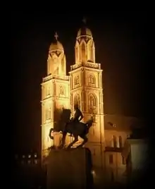 The equestrian monument at the Münsterhof plaza in front of the Fraumünster church (47°22′11″N 8°32′32″E / 47.3698°N 8.5421°E) at the Münsterbrücke crossing of the River Limmat was unveiled on 6 April 1937 by the Kämbel guild, aiming to rehabilitate Waldmann who they proposed had been the victim of a judicial murder. It was the subject of controversy for artistic reasons, deemed by conservative critics as being overly modern for the historical city centre.