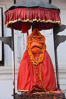 Hanuman Dhoka (Nepali: हनुमान ढोका) is a complex of structures with the Royal Palace of the Malla kings and also of the Shah dynasty in the Durbar Square of central Kathmandu, Nepal.The Hanuman Dhoka Palace (Hanuman Dhoka Darbar in Nepali) gets its name from the stone image of Hanuman, the Hindu deity, that sits near the main entryway. 'Dhoka' means door or gate in Nepali.[1] The buildings were severely damaged in the 2015 earthquake.[2]