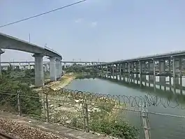 - Hanjiang Bridge, 5,242 metres (3.257 mi) long cable-stayed bridge carrying the railway over the Hanjiang River.[5]