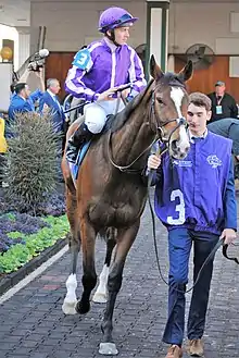 Happily is a bay filly with a white blaze bred in Ireland by the You'resothrilling Syndicate. She was sired by Galileo, who won the Derby, Irish Derby and King George VI and Queen Elizabeth Stakes in 2001. Galileo became one of the world's leading stallions and has been champion sire of Great Britain and Ireland nine times. His other progeny include Cape Blanco, Frankel, Golden Lilac, Nathaniel, New Approach, Rip Van Winkle and Ruler of the World.[2] Happily's dam You'resothrilling was a sister of the leading racehorse and stallion Giant's Causeway.[3] You'resothrilling was trained by Aidan O'Brien and won the Cherry Hinton Stakes in 2007.[4] Happily is her fifth foal, the first four being Marvellous, Gleneagles, Coolmore (C L Weld Park Stakes) and The Taj Mahal (Zipping Classic).