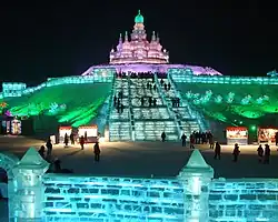 The Harbin International Ice and Snow festival (Chinese: 哈尔滨国际冰雪节; pinyin: Hā'ěrbīn Guójì Bīngxuě Jié) is an annual winter festival that takes place with a theme in Harbin, Heilongjiang, China, and now is the largest ice and snow festival in the world. At first participants in the festival were mainly Chinese, however it has since become an international festival and competition, with the festival attracting 18 million visitors and generating 28.7 billion yuan ($4.4 billion) of revenue.[1] The festival includes the world's biggest ice sculptures.[2]