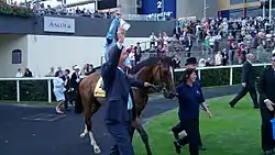 ![]() Harbinger ridden by Olivier Peslier led in by Harry Herbert after winning King George VI & Queen Elizabeth Stakes. | |