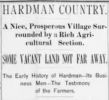 The plateau upon which Hardman sits had long been touted in the newspapers of the late 1800s. Advertisements in local papers, for example, lavished praise upon the "thriving little trade center" of Hardman. The land surrounding Hardman, for example, was described as "one of the best farming sections in Morrow county, or in any county." Marketers hailed Hardman country as "the greatest stock range in the West." It was said in the late 1800s that the location of Hardman was grand. A local newspaper advertisement described the town as "high enough to secure plenty of fresh air, level enough for the building of a magnificent city, well-watered and surrounded by the richest and most favored soil under the sun, far enough from all the other places of business to insure excellent results if energy is property directed."[7]