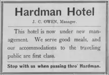 J. C. Owen assumed proprietorship of the Hardman Hotel around 1911. Other proprietors included F. M. Scrivner, E. Chapel, W. H. Royse, J. McDonald, and B. F. DeVore.[2][3][4][5][6]