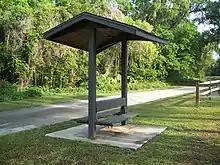 A rest stop with a covered bench on the Hardy Trail in Dade City, Florida