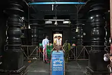 The temple is constructed in a staggered square mantapa (hall) plan, typical of Hoysala constructions. Therefore, the outer wall of the mantapa shows many projections and recesses.[3] The wall of the mantapa is a parapet wall resting on which are half pillars that support the outer ends of the roof (cornice).[4] The ceiling of the open mantapa is adorned with artistic decoration such as lotuses. The ceiling is supported by lathe turned full pillars. The material used for the temple is soapstone (also called potstone).[4][5] The original tower over the shrine (Vimana) is missing and has been replaced in modern times with one of brick and mortar.[2] Preserved within the temple premises are several old-Kannada inscriptions and hero stones.[1]
