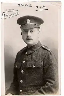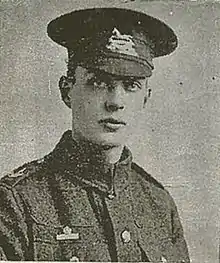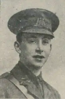 Walter Ranson (Hawke) Oliver (1894–1918) of the 63rd (Royal Naval) Division was killed in action; his monument is a stone cross.[25] Lieutenant Roy Balfour Hodgson Rayner (1893–1916) (pictured) of 15th West Yorkshire Regiment died of wounds in France on 24 May 1916. He was wounded by shrapnel while trying to rescue wounded members of a wiring party.[26][27] Lieutenant Elwyn George Renton (1886–1918) RASC, attached to the Imperial Camel Corps, died of pneumonia at the Station Hospital, Lahore on 29 May 1918. In peacetime he was a solicitor.[28][29][30] Two brothers from the Wooler family died in action, and their monument is a white marble cross. 2nd Lieutenant (active Captain) Charles Armitage Wooler (1895–1916) was in the West Yorkshire Regiment; he was wounded while leading his men into action at the Battle of the Somme, and died at Woolwich Hospital. His brother 2nd Lieutenant Herbert Sykes Wooler 2nd lieutenant of the Royal Artillery (Cantae: Intelligence Officer) of the 12th West Yorkshire Regiment (1893–1916) is buried at Lissenhuek Military Cemetery, Poperinge, Belgium.[31]