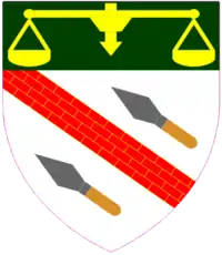 Argent a bend Gules masoned Or between two masons' trowels bendwise Proper on a chief Vert a balance Or.
