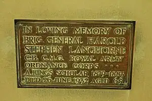 A brass plaque was put up in his memory at Rochester Cathedral. It reads: "In loving memory of Brig General Harold Stephen Langhorne CB CMG Royal army ordnance corps. A Kings scholar 1879-1883. Died 26 June 1932 aged 65".