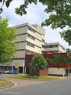 The hospital was opened in 1909 in the north of the parish of Hornchurch by West Ham County Borough council, as the Grange convalescent home for children, which operated with the nearby Plaistow fever hospital.[1] The Grange had been a private house, built in 1884 by John Compton, owner of the Gubbins estate. The convalescent home was maintained by the county borough until the Second World War, as an emergency hospital. After the war it became a permanent hospital, and in the 1960s was significantly enlarged.[2]