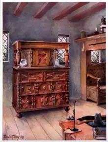 Fowler donated the Putnam cupboard of English oak and cedar to the Essex Institute. Her ancestor, John Putnam, imported it probably about the middle of the 17th century, as the chest of drawers which forms its lower part was not developed earlier, nor were the geometrical patterns of the cedar mouldings used in combination with the split balusters upon the pilasters, until that date. Upon its back are marks of a fire from which the cupboard was rescued when, some two centuries ago, the Putnams' house was destroyed. Certain vase finials which surmounted the posts, 'improvements' suggested by the taste of an 18th-century member of the family, were removed. The enclosed box settle with lifting lid in the Bulkeley Collection is almost unique among examples of colonial woodwork; when discovered in a stable at Barrington, Massachusetts, it had for many years been used to hold salt for cattle. It illustrates the earliest of the English modes of combining the chest and the table which produced the settle. The panelled framing of the seat indicates that cushions were intended. The usual type of earlier colonial settle more nearly resembled the high-back variety one finds in old village inns in this country. They were drawn in front of the fire upon a winter's night—especially when of curved shape, as in some old English inns until recent days—for the sake of light as well as warmth, in those days when the flicker of the Betty lamp, shown in the art work as an example, was the sole other illumination.[4]