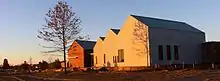 The visitor center and gardens were designed by GWWO, Inc., Architects, an architectural design firm based in Baltimore. Chris Elcock was the lead architect.[10] The buildings were located on the site and oriented to face north, the direction in which Tubman led slaves to freedom.[13] Plans called for four buildings, three dedicated to exhibits and one to house administrative offices. Each of the buildings is shaped like a barn, since Tubman and the slaves she was leading to freedom often slept in barns at night and barns are evocative of the rural architecture of the area. The three exhibit buildings are clad in a light green zinc siding which will dull with time. Zinc was chosen because it is a self-healing material which the architects felt reflected the healing which has gone on since the American Civil War. The administration building is clad in wood.[10] Construction of the buildings utilized a number of craftsman. Building materials included stone and reclaimed wood, and the architectural style featured exposed beams and timbers. The buildings were designed to have windows which featured views of the surrounding wildlife refuge, little of which had changed since Tubman's day.[13] All the structures were designed to be green buildings with at least a LEED Silver certification. The buildings feature geothermal heating and cooling, green roofs, permeable paving in parking areas and on pathways, and solar-powered external lighting.[13]