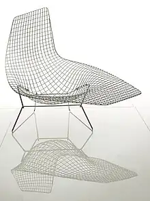 Starting out as a painting student but soon being asked to reopen the metal workshop in 1939, Bertoia taught jewelry design and metal work. Later, as the war effort made metal a rare and very expensive commodity he began to focus his efforts on jewelry making, even designing and creating wedding rings for Ray Eames and Edmund Bacon's wife Ruth. When all the metal was taken up by war efforts, he became the graphics instructor. Still at Cranbrook, in 1943 he married Brigitta Valentiner, and then moved to California to work for Charles and Ray at the Molded Plywood Division of the Evans Product Company. Bertoia also learned welding techniques at Santa Monica College and began experimenting with sound sculptures.[4] Bertoia worked there until 1946, then sold his jewelry and monotypes until obtaining work with the Electronics Naval Lab in La Jolla. In 1950, he was invited to move to Pennsylvania to work with Hans and Florence Knoll. (Florence studied also at Cranbrook.) During this period he designed five wire pieces that became known as the Bertoia Collection for Knoll. Among these was the famous diamond chair, a fluid, sculptural form made from a welded lattice work of steel.[2]