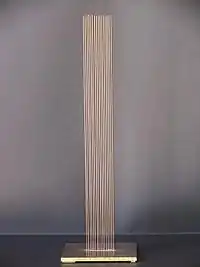 In the mid-1950s, the chairs being produced by Knoll sold so well that the lump sum payment arrangement from Knoll allowed Bertoia to devote himself exclusively to sculpture. He ultimately produced over 50 commissioned public sculptures, many of which remain viewable. In the 1960s, he began experimenting with sounding sculptures of tall vertical rods on flat bases. He renovated the old barn into an atypical concert hall and put in about 100 of his favorite "Sonambient" sculptures. Bertoia played the pieces in a number of concerts and even produced a series of eleven albums, all entitled "Sonambient,"[5] of the music made by his art, manipulated by his hands along with the elements of nature. In the late 1990s, his daughter found a large collection of near mint condition original albums stored away on his property in Pennsylvania. These were sold as collector's items. In 2015, these Sonambient recordings were re-issued by Important Records as a box set with a booklet of the history and previously unseen photos.