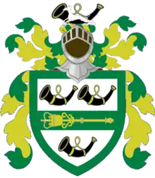 Argent on a fess Vert between three bugle-horns Sable stringed Or a representation of the Speaker’s Mace in fess head to the dexter Or a bordure Vert.[2]