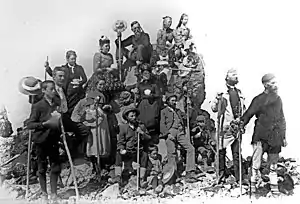 Harry Peters, standing far right, with a party of climbers on the summit of Mount Taranaki, 11 Feb 1892