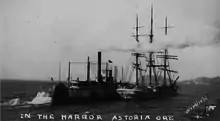 Harvest Queen with the troops on board arrived at the O.R.& N.'s dock in Astoria at 10:30 a.m. on June 16, 1896.[22] An encampment was set up in the courthouse square.[22] Troops were detailed to serve as cannery guards, and a Gatling gun was set up on a tugboat to serve as a harbor patrol vessel.[22] No disturbance was noted.[22] On June 21, 1896, Colonel Summers was ordered to return to Portland with his command, but leave behind in Astoria about 100 troops, with the Gatling guns.[22] The troops returned to Portland on board Harvest Queen.