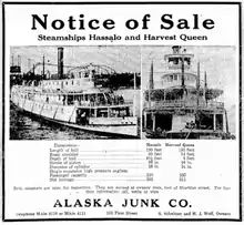 On June 30, 1926, the Oregon-Washington Railway and Navigation Company, the legal successor to the O.R.&N, sold Harvest Queen and Hassalo to the Alaska Junk Company.[40] The retirement of these two vessels from the once large O-W R.&.N. fleet left only two steamers remaining, the small propeller Nahcotta, then running as a ferry between Astoria and Megler, Washington, and the then new sternwheeler Lewiston, built in 1923 and operating on the Snake River.[40] At the time of the sale, both Harvest Queen and Hassalo were moored in the Willamette River at Albina.[40]