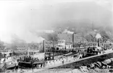 In April 1894, Harvest Queen embarked 300 troops from the barracks of Vancouver Barracks to be transported to Kalama in case of trouble caused by "Commonwealers" at Puyallup, Washington.[18] A Northern Pacific special train was waiting at Kalama to transport the troops to Puyallup.[18] The Commonwealers were a branch of Coxey's Army, an organization of laborers that arose in the context of the widespread unemployment following the Panic of 1893.[19] The general plan of the Commonwealers, and similar groups around the country, was to travel to Washington, D.C. to protest, seeking government funding of projects that would produce jobs for the unemployed.[19] Trouble had come in various cities as the Commonwealers boarded trains without paying fares.[19] A large rally of the Commonwealers took place in Puyallup, Washington near the end of April, 1894.[19] No transport of troops from Vancouver Barracks was ordered however, and at 4:00 p.m. on May 2, 1894, Harvest Queen was discharged from War Department service, and returned to Portland.[20]
