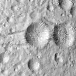 Hassan is an impact crater on the southern hemisphere of Saturn's moon Enceladus. Hassan was first observed in Cassini images during that mission's March 2005 flyby of Enceladus. It is located at 31.3° South Latitude, 188.5° West Longitude, and is 14.5 kilometers across.[1] Numerous criss-crossing fractures cut across Hassan, breaking up the regolith on the crater floor.