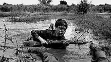 In the photo, Jangju is crawling through muddy ground of the marshes in south of Iran while he is holding a rifle in ready state.[1] The photograph was widely shared and was published in several media outlets both due to the special style of the soldier and it also attracted a lot of attention since the family name of the boy, "Jangju" meaning Warrior in Persian language was a good fit for the picture.[3] Alfred Yaghobzadeh was working for the Gamma and Associated Press news agencies at the time of capturing the famous photograph. The same photo was used as propaganda for recruiting volunteers by the Iranian authorities during the Iran–Iraq war and afterwards.[1]