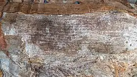 The Hathigumpha Inscription (pronounced: ɦɑːt̪ʰiːgumpʰɑː) is a seventeen line inscription in a Prakrit language incised in Brahmi script in a cavern called Hathigumpha in Udayagiri hills, near Bhubaneswar in Odisha, India. Dated between the second century BCE and the first century CE,[2][3][4] it was inscribed by the Jain king Kharavela of the Kalinga kingdom.[5][note 1]