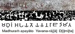 a mention of Greek rule and claims of their retreat to Mathura;[22] Scholars debate on whether this refers to Demetrios of Bactria, though it most likely references another Indo-Greek ruler[26] |