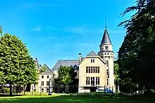 The original castle consists of an angular, Neo-Gothic three-story building, with two circular turrets, roofed conically in grey slate, mullioned windows, and colonnaded galleries.