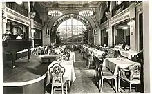 The Café Piccadilly could accommodate some 2,500 guests and was lavishly decorated with wall and ceiling paintings and Sienese marble.[7][8] Operated by Heinrich Braun,[9][10] it was an attraction comparable to the Moulin Rouge in Paris,[11] drawing "white collar workers, business people and tourists" by day, "amusement seekers, restaurant and variety patrons and also prostitutes" at night.[9] One of Ernst Ludwig Kirchner's Street Scenes cycle of paintings, Potsdamer Platz in Berlin (1914), depicts two prostitutes on a traffic island in front of the building and the Potsdamer Bahnhof.[12][13][14] After World War I began in 1914, it was renamed to the more patriotic Café Vaterland.[13][15][n 1]
