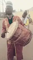 Algaita player, a type of multi-reed instrument like a clarinet or oboe.