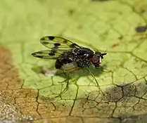 Research on the taxonomy and biology of picture-wing flies in the 1970's led to the description of 105 species, with several more described in the decades since.[9] More recent studies on variation in wing patterns has led to the generation of a database devoted solely to wing diversity in the Hawaiian Drosophila lineage.[10] These flies have also been extensively studied for their courtship behavior, potential for hybridization between species, and larval ecology.[11] Many species of picture-wing flies breed in rotting bark and stems.[12]