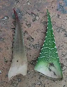 It is frequently confused with the rarer Haworthiopsis fasciata, to which it looks very similar. However Haworthiopsis attenuata can easily be distinguished by its white tubercles, which occur on both upper and lower sides of its leaves (H. fasciata has tubercles only on the underside, with a smooth upper surface of its leaves). A fundamental distinction is that H. attenuata's leaves are not fibrous. In addition, the leaves of H.attenuata are often (though not always) longer, thinner, and more splayed out.[2][3]