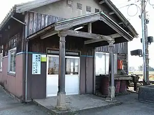 The station has two opposed ground-level side platforms connected to the wooden station building by a level crossing. The station is unattended.