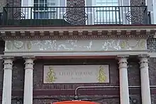 The entrance doorway is a brick arch, which contains impost blocks on either side, as well as a console-shaped keystone at the top. Within this arch are a set of wooden double doors, which are flanked by Ionic-style columns and by sidelights containing lozenge and oval patterns. The brick arch is flanked on either side by paired columns with Corinthian-style capitals. There are electronic signs between each column pair; these rest on pedestals and are topped by urns and volutes. A band course runs above the arch, behind the paired columns. Above this is a stone plaque with inscribed letters reading "The Little Theatre MCMXII", as well as a pair of dancing figures in low relief. The paired columns support a stone architrave above the doors.[14]