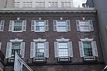 The second and third stories each contain six sash windows flanked by shutters.[8][16] The second-story window panes are arranged in an eight-over-twelve format; above them are splayed stone lintels, containing keystones with bead motifs and brackets. There are curved metal balconies in front of the four westernmost windows, while the two easternmost windows share a terrace over the main entrance. The third-story window panes are arranged in an eight-over-eight format with paneled keystones. A cornice with modillions runs above the third story. A balustrade formerly ran above the cornice but has since been removed.[16]
