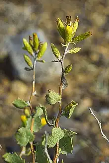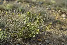 Hazardia rosarica is a species of flowering shrub in the family Asteraceae commonly known as the El Rosario goldenbush.[2] Hazardia rosarica is a fragrant shrub characterized by its zigzagged branches, toothed glutinous leaves, and yellow flower heads of only disc flowers. This species is endemic to Mexico and is only found in the region near of the town of El Rosario in Baja California. It is usually found on north and east facing slopes and ridgetops close to the coast.[2][3]