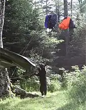 Harmful encounters between animals and people can occur when animals try to get human food. Above a Black Bear is unsuccessful getting into backpacks because they are hung out of reach. Proper food storage protects both people and animals.