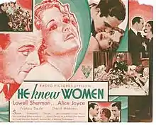 He Knew Women is a 1930 American pre-Code comedy film directed by Hugh Herbert, from a screenplay by him and William B. Jutte, which was adapted from S. N. Behrman's 1927 play The Second Man. It starred Lowell Sherman and Alice Joyce, in her second to last film role. The film broke even.[3]