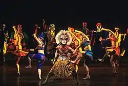 Later, in Act II, Rafiki finds a lonely and forlorn Simba in the jungle and explains to the lion that his father Mufasa lives on through the song "He Lives in You". In the musical, this serves as a reprise of "They Live in You". Simba follows Rafiki to a pool of water, in which Simba sees only his own reflection at first and is sceptical. As the song becomes quieter, however, the face of Mufasa appears above the stage in the starry night sky. He tells Simba to "Remember who you are." before fading away. Simba, invigorated and realising what he now must do, leaps up from the pool as ensemble singers appear on the stage for the second part of the song. The ensemble, Rafiki, and Simba join together in a joyous celebration before Simba returns to the Pride Lands to challenge Scar.